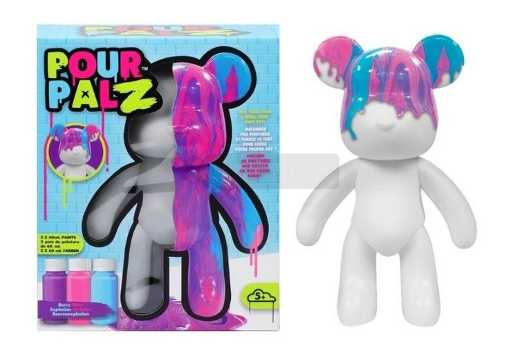 Ten ekscytujący zestaw pozwala przekształcić zwykłego białego misia w olśniewające arcydzieło przy użyciu różowej, niebieskiej i fioletowej farby. Wystarczy wymieszać i wylać żywe kolory na swojego misia, aby stworzyć hipnotyzujące efekty marmuru.