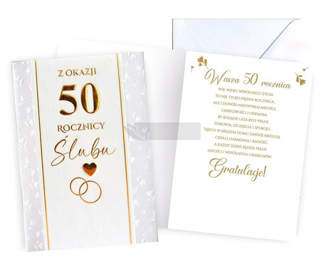 Kartka Dream Cards "Z okazji 50. rocznicy ślubu" DK-1343 Kartka B6 z ozdobnej serii Dream Cards - nieduża, ale robi wrażenie dzięki atrakcyjnej kolorystyce i ciekawym zdobieniom. To idealny wybór łączący przyjazną cenę z jakością. Cechy szczególne: wielkość: B6, 16.6 x 11.7 cm po złożeniu, koperta: w zestawie, kolorowa, zdobienia: kolorowe, różnorodne, bogate (w zależności od wzoru: przyklejane dekoracje, elementy biżuteryjne, odstawniki, metaliczne folie, tłoczenia itp.), okazja: Rocznica