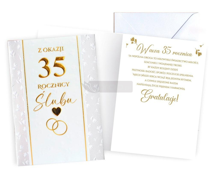 Kartka Dream Cards "Z okazji 35. rocznicy ślubu" DK-1340 Kartka B6 z ozdobnej serii Dream Cards - nieduża, ale robi wrażenie dzięki atrakcyjnej kolorystyce i ciekawym zdobieniom. To idealny wybór łączący przyjazną cenę z jakością. Cechy szczególne: wielkość: B6, 16.6 x 11.7 cm po złożeniu, koperta: w zestawie, kolorowa, zdobienia: kolorowe, różnorodne, bogate (w zależności od wzoru: przyklejane dekoracje, elementy biżuteryjne, odstawniki, metaliczne folie, tłoczenia itp.), okazja: Rocznica