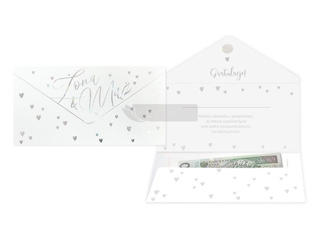 Koperta podarunkowa na Ślub KOP-028 Koperta podarunkowa jest eleganckim sposobem na podarowanie bliskiej osobie banknotu lub karty podarunkowej. Koperta jest kolorowa i uszlachetniona metalizowaną folią hot-stamp, jest solidnie wykonana i wyposażona w rzep, co umożliwia jej wielokrotne otwieranie i zamykanie. Koperta zawiera życzenia w środku. Specyfikacja: wymiary: 20 x 10,5 cm (po złożeniu) wnętrze: życzenia w środku okazja: Ślub