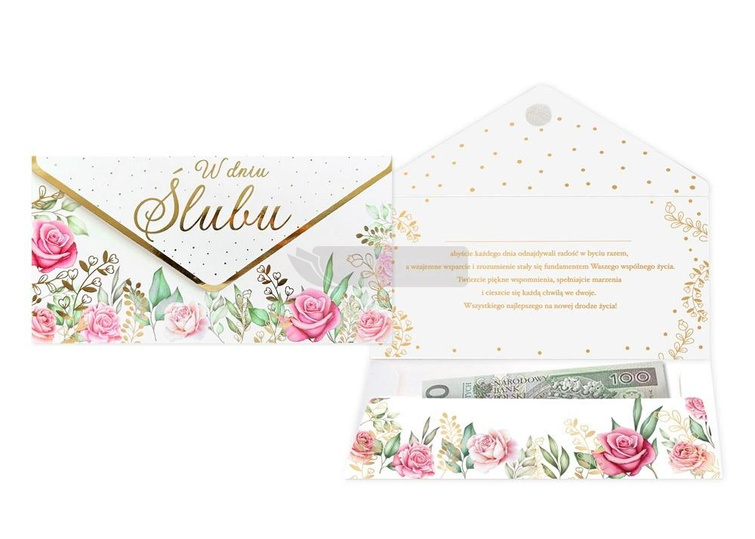 Koperta podarunkowa na Ślub KOP-027 Koperta podarunkowa jest eleganckim sposobem na podarowanie bliskiej osobie banknotu lub karty podarunkowej. Koperta jest kolorowa i uszlachetniona metalizowaną folią hot-stamp, jest solidnie wykonana i wyposażona w rzep, co umożliwia jej wielokrotne otwieranie i zamykanie. Koperta zawiera życzenia w środku. Specyfikacja: wymiary: 20 x 10,5 cm (po złożeniu) wnętrze: życzenia w środku okazja: Ślub