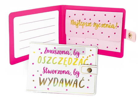 Portfelik POR-007 "Zmuszona, by oszczędzać. Stworzona, by wydawać" Portfeliki z życzeniami to alternatywa dla tradycyjnych kartek, są wyjątkowym sposobem na podarowanie bliskiej osobie banknotu. Portfeliki są kolorowe i uszlachetnione metalizowaną folią hot-stamp, oraz są wyposażone w zamknięcie na zatrzask, co umożliwia ich wielokrotne otwieranie i zamykanie - jak w prawdziwym portfelu. Portfeliki zawierają niebanalne teksty oraz życzenia w środku. Specyfikacja: wymiary: 11 x 8 cm (po złożeniu) wnętrze: życzenia w środku waga: 13 g okazja: ogólne życzenia