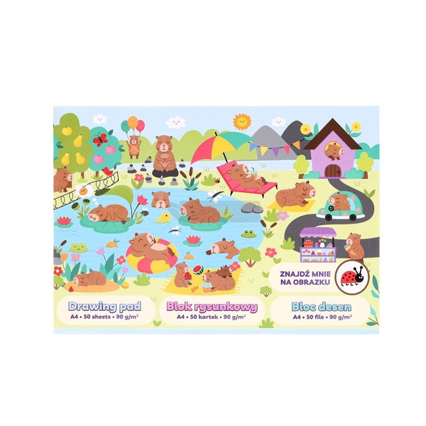 Oto blok rysunkowy A4 Kapibary, który od pierwszego spojrzenia zachwyca uroczą okładką i... zaprasza do zabawy! Znajdź ukrytą biedronkę wśród kapibar i rozbudź kreatywność już zanim otworzysz pierwszą stronę!