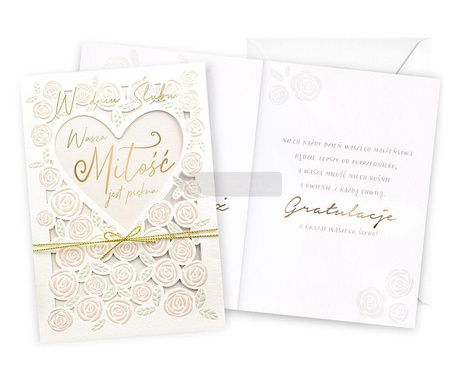 Kartka Dream Cards na Ślub DK-1322 Kartka B6 z ozdobnej serii Dream Cards - nieduża, ale robi wrażenie dzięki atrakcyjnej kolorystyce i ciekawym zdobieniom. To idealny wybór łączący przyjazną cenę z jakością. Cechy szczególne: wielkość: B6, 16.6 x 11.7 cm po złożeniu, koperta: w zestawie, kolorowa, zdobienia: kolorowe, różnorodne, bogate (w zależności od wzoru: przyklejane dekoracje, elementy biżuteryjne, odstawniki, metaliczne folie, tłoczenia itp.), okazja: Ślub