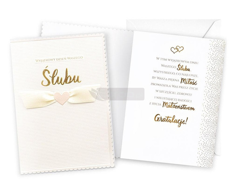 Kartka Dream Cards na Ślub DK-1321 Kartka B6 z ozdobnej serii Dream Cards - nieduża, ale robi wrażenie dzięki atrakcyjnej kolorystyce i ciekawym zdobieniom. To idealny wybór łączący przyjazną cenę z jakością. Cechy szczególne: wielkość: B6, 16.6 x 11.7 cm po złożeniu, koperta: w zestawie, kolorowa, zdobienia: kolorowe, różnorodne, bogate (w zależności od wzoru: przyklejane dekoracje, elementy biżuteryjne, odstawniki, metaliczne folie, tłoczenia itp.), okazja: Ślub