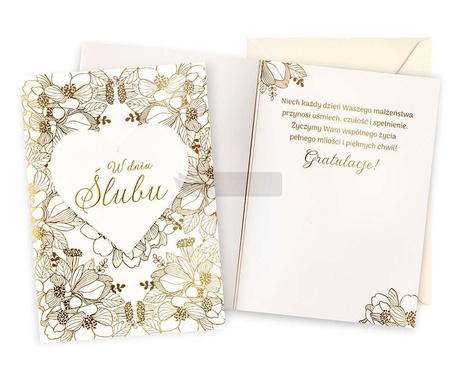 Kartka Dream Cards na Ślub DK-1319 Kartka B6 z ozdobnej serii Dream Cards - nieduża, ale robi wrażenie dzięki atrakcyjnej kolorystyce i ciekawym zdobieniom. To idealny wybór łączący przyjazną cenę z jakością. Cechy szczególne: wielkość: B6, 16.6 x 11.7 cm po złożeniu, koperta: w zestawie, kolorowa, zdobienia: kolorowe, różnorodne, bogate (w zależności od wzoru: przyklejane dekoracje, elementy biżuteryjne, odstawniki, metaliczne folie, tłoczenia itp.), okazja: Ślub