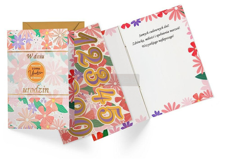 Kartka Dream Cards "W dniu urodzin" DK-1309 Kartka B6 z ozdobnej serii Dream Cards - nieduża, ale robi wrażenie dzięki atrakcyjnej kolorystyce i ciekawym zdobieniom. To idealny wybór łączący przyjazną cenę z jakością. Cechy szczególne: wielkość: B6, 16.6 x 11.7 cm po złożeniu, koperta: w zestawie, kolorowa, zdobienia: kolorowe, różnorodne, bogate (w zależności od wzoru: przyklejane dekoracje, elementy biżuteryjne, odstawniki, metaliczne folie, tłoczenia itp.), okazja: urodziny