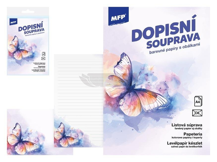 Zestaw papeterii. Zawiera 10 kartek A4 z nadrukiem oraz 5 kopert C6 z nadrukiem. Cały zestaw jest zapakowany w twardą oprawkę z nadrukiem i zafoliowany, posiada również eurozawieszkę. Wymiar: 160mm x 220mm x 10mm (szer. x wys. x gł.) Wyprodukowano w UE.