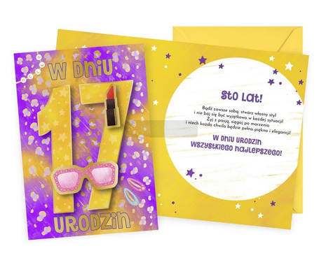 Kartka Dream Cards "W dniu 17 urodzin" DK-1272 Kartka B6 z ozdobnej serii Dream Cards - nieduża, ale robi wrażenie dzięki atrakcyjnej kolorystyce i ciekawym zdobieniom. To idealny wybór łączący przyjazną cenę z jakością. Cechy szczególne: wielkość: B6, 16.6 x 11.7 cm po złożeniu, koperta: w zestawie, kolorowa, zdobienia: kolorowe, różnorodne, bogate (w zależności od wzoru: przyklejane dekoracje, elementy biżuteryjne, odstawniki, metaliczne folie, tłoczenia itp.), okazja: urodziny