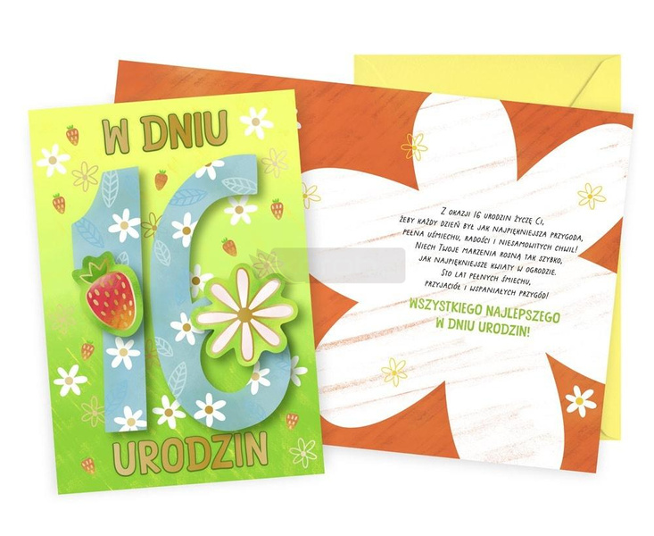 Kartka Dream Cards "W dniu 16 urodzin" DK-1270 Kartka B6 z ozdobnej serii Dream Cards - nieduża, ale robi wrażenie dzięki atrakcyjnej kolorystyce i ciekawym zdobieniom. To idealny wybór łączący przyjazną cenę z jakością. Cechy szczególne: wielkość: B6, 16.6 x 11.7 cm po złożeniu, koperta: w zestawie, kolorowa, zdobienia: kolorowe, różnorodne, bogate (w zależności od wzoru: przyklejane dekoracje, elementy biżuteryjne, odstawniki, metaliczne folie, tłoczenia itp.), okazja: urodziny