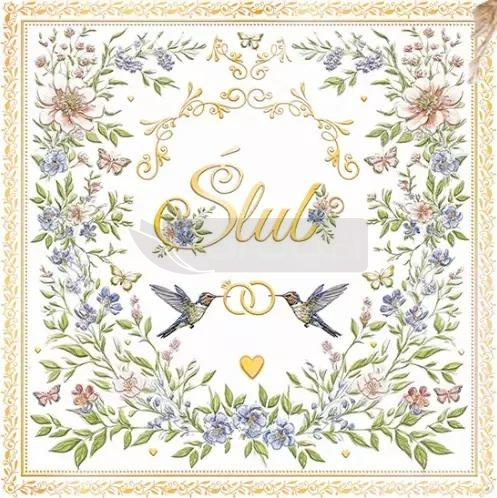Karnet kwadratowy 15 x 15 cm. Złocony i tłoczony, teksy życzeń w środku. Wydrukowany na wysokiej jakości papierze. W zestawie koperta.
