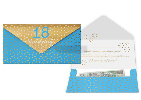 Koperta podarunkowa KOP-023 "18 urodziny" Koperta podarunkowa jest eleganckim sposobem na podarowanie bliskiej osobie banknotu lub karty podarunkowej. Koperta jest kolorowa i uszlachetniona metalizowaną folią hot-stamp, jest solidnie wykonana i wyposażona w rzep, co umożliwia jej wielokrotne otwieranie i zamykanie. Koperta zawiera życzenia w środku. Specyfikacja: wymiary: 20 x 10,5 cm (po złożeniu) wnętrze: życzenia w środku okazja: osiemnastka, urodziny Koperty są pakowane po 3 szt.