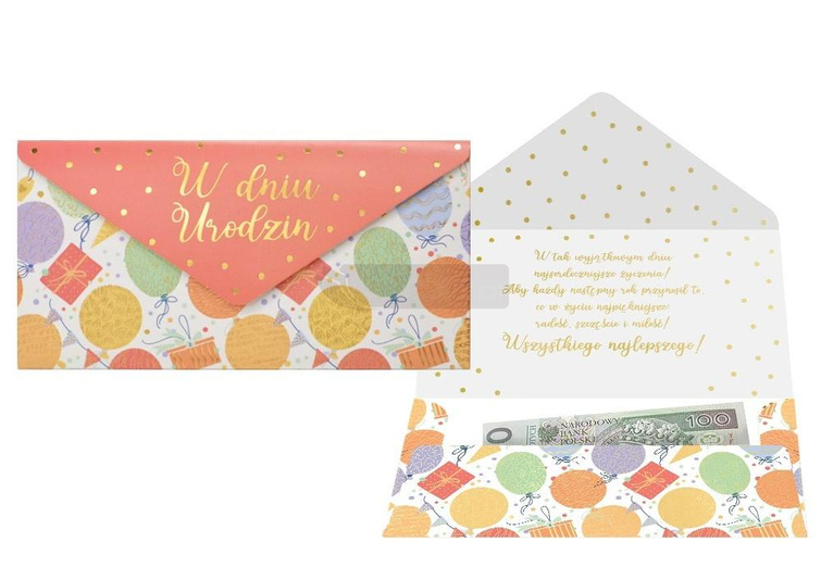 Koperta podarunkowa KOP-022 "W dniu urodzin" Koperta podarunkowa jest eleganckim sposobem na podarowanie bliskiej osobie banknotu lub karty podarunkowej. Koperta jest kolorowa i uszlachetniona metalizowaną folią hot-stamp, jest solidnie wykonana i wyposażona w rzep, co umożliwia jej wielokrotne otwieranie i zamykanie. Koperta zawiera życzenia w środku. Specyfikacja: wymiary: 20 x 10,5 cm (po złożeniu) wnętrze: życzenia w środku okazja: urodziny Koperty są pakowane po 3 szt.