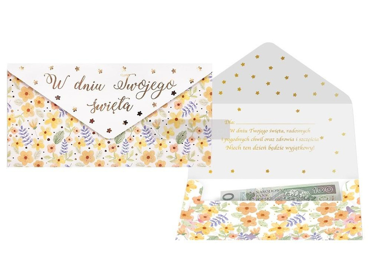 Koperta podarunkowa KOP-015 "W dniu Twojego święta" Koperta podarunkowa jest eleganckim sposobem na podarowanie bliskiej osobie banknotu lub karty podarunkowej. Koperta jest kolorowa i uszlachetniona metalizowaną folią hot-stamp, jest solidnie wykonana i wyposażona w rzep, co umożliwia jej wielokrotne otwieranie i zamykanie. Koperta zawiera życzenia w środku. Specyfikacja: wymiary: 20 x 10,5 cm (po złożeniu) wnętrze: życzenia w środku okazja: ogólne życzenia, urodziny Koperty są pakowane po 3 szt.