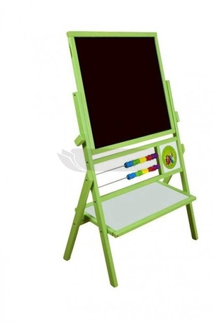 Obrotowa, kolor zielony, suchościeralno-kredowo-magnetyczna tablica z 2-rzędowym liczydłem. 3 rodzaje zegara z ruchomymi wskazówkami. Wyposażona w gąbkę i kredę. Marker w zestawie.