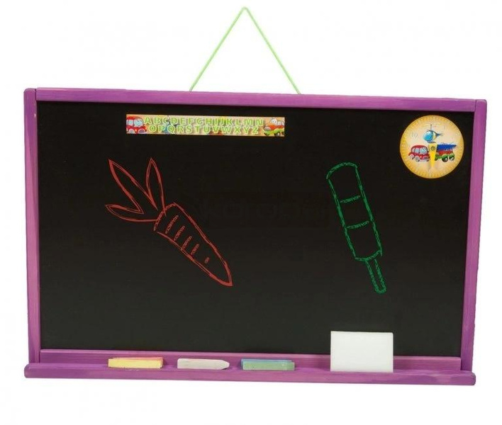 Wisząca jednostronna drewniana kredowa tablica z podstawą na kredę. 3 rodzaje zestawu etykiet: alfabet + zegar z ruchomymi wskazówkami. Wyposażona w gąbkę oraz kredę.