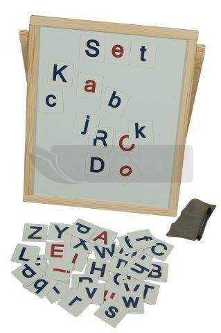 Drewniana magnetyczna rozkładana tablica z magnetycznym alfabetem, komplet 52 magnesów - małe i duże litery. Zestaw zawiera marker