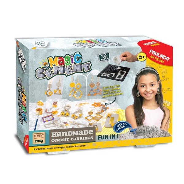 Kreatywny zestaw Strigo do samodzielnego stworzenia cementowych kolczyków. Idealny produkt do rozwijania zdolności manualnych i pobudzenia kreatywności. Rozwija również stymulacje sensoryczne, dzięki kolorom i różnym teksturom. Wystarczy wymieszać cement z wodą, wlać do foremki i zaczekać do całkowitego wyschnięcia. Następnie w indywidualny sposób pomalować powstałe elementy. W zestawie: magiczny cement, plastikowe formy, pigmenty, pędzelek, paletka, miseczka, mieszadło, złote i srebrne komponenty kolczyków, wodoodporna mata i rękawiczki, forma PVC.