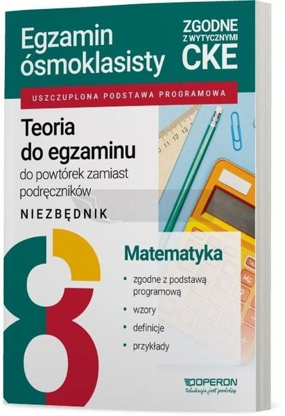 "Teoria do egzaminu. Egzamin ósmoklasisty 2025. Matematyka Publikacja aktualna z wymaganiami CKE z dnia 31.07.2024,opracowana przez organizatora największych, ogólnopolskich próbnych egzaminów w Polsce. Do powtórek zamiast z podręczników Nie pamiętasz definicji, wzoru albo jakiejś innej szczegółowej informacji? Nie masz już dostępu do swoich podręczników? Niezbędne wiadomości, potrzebne do rozwiązywania zadań na egzaminie ósmoklasisty z matematyki znajdziesz w publikacji "Teoria do egzaminu. Egzamin ósmoklasisty 2025. Matematyka". Zebrane tam informacje zostały podane w przystępnej i skróconej formie. Korzystając z tej książki, szybko: powtórzysz, uzupełnisz i poukładasz sobie w głowie wiedzę niezbędną do zdania egzaminu ósmoklasisty z wysokimi wynikami. Co znajdziesz w publikacji "Teoria do egzaminu. Egzamin ósmoklasisty 2025. Matematyka"? Publikacja "Teoria do egzaminu" zawiera: niezbędną, usystematyzowaną teorię do każdego działu przydatną na egzaminie, atrakcyjną formę powtórek przed egzaminem ósmoklasisty, zestawienie wzorów i ich zastosowań. Znajdziesz tutaj też porady, jak radzić sobie ze stresem, i podpowiedzi, jak skutecznie uczyć się do egzaminu. To nie wszystko Chcesz przypomnieć sobie teorię, ale także poćwiczyć rozwiązywanie zadań egzaminacyjnych, dowiedzieć się, co zrobić, żeby zyskać maksimum punktów na egzaminie? To znaczy, że szukasz jednej książki, jaką jest publikacja "Zadania z odpowiedziami. Egzamin ósmoklasisty 2025. Matematyka". Być może chcesz sprawdzić się przed egzaminem? Jeśli tak, to wybierz "Arkusze z rozwiązaniami krok po kroku. Egzamin ósmoklasisty 2025. Matematyka". Możesz także skorzystać z Platformy Operon dla ucznia, czyli naszego cyfrowego wsparcia przed egzaminem ósmoklasisty. Znajdziesz tu pełne odpowiedzi do wszystkich zadań wraz z etapami dochodzenia do rozwiązania."