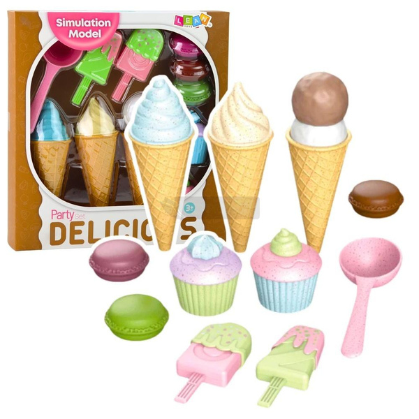 Kolorowy zestaw lodów i słodkości to doskonała propozycja zabawki, która przenosi dzieci do świata pysznych deserów i kreatywnej zabawy w odgrywanie ról. Zestaw zawiera różne elementy - lody w rożkach, lody na patyku, babeczki, makaroniki oraz łyżkę do nakładania. Wszystko zostało wykonane z dbałością o szczegóły, aby jak najbardziej przypominało prawdziwe smakołyki.