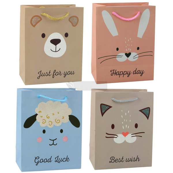 Urocza torba prezentowa z motywem zwierzątek to doskonały wybór na każdą okazję! Wykonana z wysokiej jakości papieru, torba wyróżnia się uroczymi grafikami zwierzątek: misia, króliczka, owieczki oraz kotka. Każdy wzór posiada brokatowe elementy, które dodają blasku i sprawiają, że torba prezentuje się wyjątkowo i elegancko.