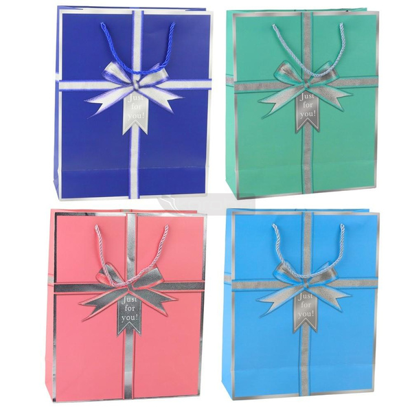 Elegancka torba prezentowa o klasycznym designie, która nadaje każdemu upominkowi wyjątkowego charakteru. Wykonana z wysokiej jakości kartonu ozdobnego, torba zachwyca minimalistycznym wzornictwem i subtelnym połyskiem. Głównym motywem jest efektowna kokarda w srebrnym kolorze z napisem "Just for you!", która dodaje torbie wyjątkowej elegancji i sprawia, że świetnie nadaje się na różnorodne okazje - od urodzin, przez rocznice, po święta i spotkania okolicznościowe.