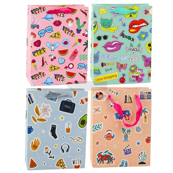 Torba prezentowa z naklejkowym motywem, która zachwyca żywymi kolorami i nowoczesnym stylem! Torba ozdobiona jest różnorodnymi grafikami w formie kolorowych naklejek, takich jak serca, usta, owoce, napisy oraz symbole młodzieżowe i lifestylowe. Taki wzór sprawia, że torba wygląda wyjątkowo modnie i oryginalnie.