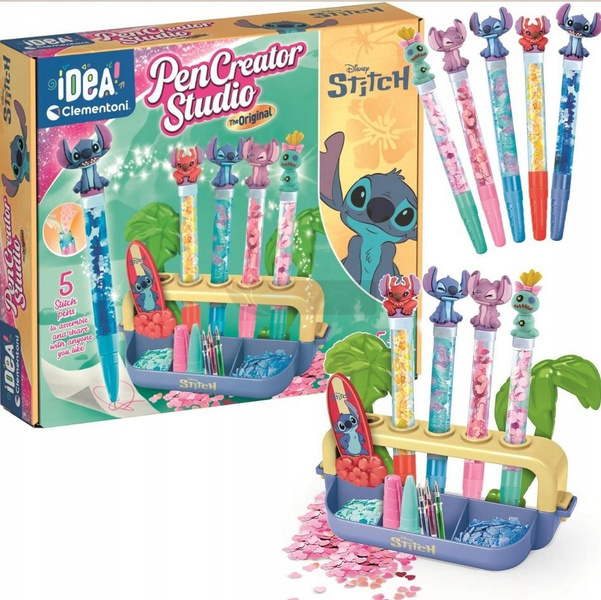 Praktyczny pulpit i bogaty zestaw narzędzi do personalizowania swoich długopisów wieloma dodatkami i sympatycznymi postaciami z bajki o Stitchu.
