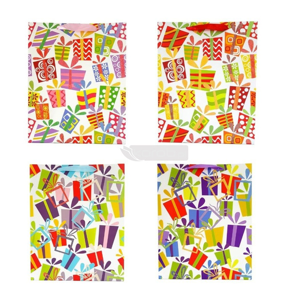 Uniwersalna torebka prezentowa z wzorem kolorowych prezentów (z brokatowymi elementami) wykonana z grubszego papieru o gramaturze 210 g, co zapewnia jej większą trwałość i odporność na obciążenie. Wyposażona w elegancką tasiemkę, który zapewnia wygodny uchwyt i estetyczne wykończenie. To praktyczne opakowanie, które podkreśla wartość wręczanego prezentu.