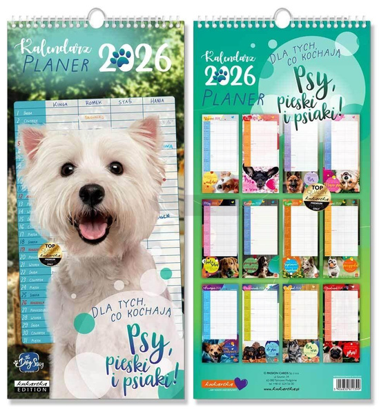 Planer 2026 Psy, pieski i psiaki Podłużny kalendarz ścienny na rok 2026 z najpiękniejszymi pieskami. Każdy miesiąc cieszy pieknym zdjęciem psa, która będzie wspaniałą ozdobą Waszego domu. Planer PSY pozwoli być na bieżąco ze wszystkimi zajęciami każdego członka rodziny (podział na 4 osoby) - wszystkie treningi piłkarskie, zajęcia językowe, urodziny, wspólne wyjazdy - nic Cię już nie zaskoczy :) Taki kalendarz to idealny prezent dla miłośników psów Specyfikacja: Wielkość: 21 x 45 cm Kalendarium: można po nim pisać Styl: cytaty, nowoczesny, klasyczny, zdjęciowy