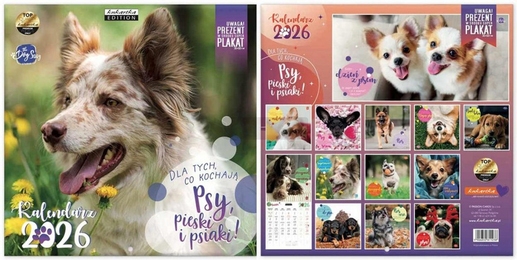 Kalendarz 2026 Psy, pieski i psiaki Kwadratowy kalendarz ścienny na rok 2026 z serii "Psy, pieski i psiak". Każdy miesiąc przyozdabia inny psiak, który będzie wspaniałą ozdobą Waszego domu. Taki kalendarz to idealny prezent dla miłośników psów. Kalendarz po rozłożeniu ma wymiary 30x60 cm - górny kwadrat wypełnia zdjęcie, a dolny kalendarium. PREZENT: w środku kalendarza znajdziecie plakat ze zdjęciem psiaka o wymiarach 30x 60 cm Specyfikacja: Wielkość: 30 x 30 cm (po rozłożeniu 30 x 60 cm) Gratis: plakat Styl: cytaty, nowoczesny, klasyczny, zdjęciowy