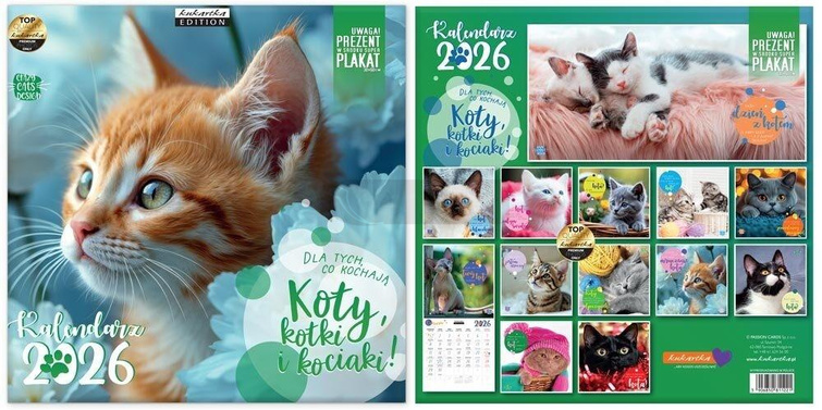 Kalendarz 2026 Koty, kotki i kociaki Kwadratowy kalendarz ścienny na rok 2026 z serii "Koty, kotki i kociaki". Każdy miesiąc przyozdabia zdjęcie kociaka, który będzie wspaniałą ozdobą Waszego domu. Taki kalendarz to idelany prezent dla miłośników kotów. Kalendarz po rozłożeniu ma wymiary 30x60 cm - górny kwadrat wypełnia zdjęcie, a dolny kalendarium. PREZENT: na środku kalendarza znajdziecie plakat ze zdjęciem kociaka o wymiarach 30x 60 cm Specyfikacja: Wielkość: 30 x 30 cm (po rozłożeniu 30 x 60 cm) Gratis: plakat Styl: cytaty, nowoczesny, klasyczny, zdjęciowy