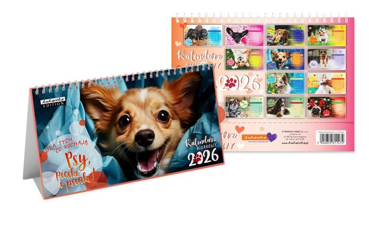 Kalendarz biurkowy 2026 Psy, pieski, psiaki Kalendarz na biurko na rok 2026 z serii " Psy, pieski, psiaki" Każdy miesiąc cieszy pięknym zdjęciem psa miesiąca i inspirującym cytatem, które będzie wspaniałą ozdobą Waszego domu lub biura. Taki kalendarz to idealny prezent dla miłośników psów. Kalendarz ma wymiary 21x12 cm Dodatkowe kalendarium na odwrocie z miejscem na notatki Styl: cytaty, nowoczesny, klasyczny, zdjęciowy Prezent: dodatkowe kalendarium stycznia 2027