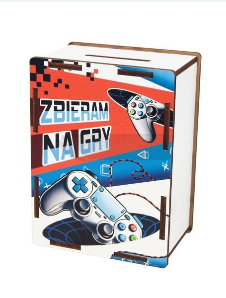 Drewniana, ekologiczna skarbonka dla gracza z ciekawą grafiką i hasłem Zbieram na gry. Posiada specjalny otwór na górze do wrzucania monet i banknotów. Skarbonka CRESCO to świetny prezent, który uczy oszczędności młodego człowieka. Skarbonka nie zawiera zawartości, ale po zakupie jest od razu gotowa na przyjecie gotówki :) Skarbonka sprzedawana jest już złożona w opakowaniu foliowym.