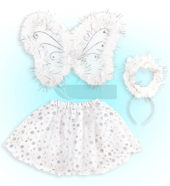 Do spódniczki dołączone są efektowne białe skrzydełka ozdobione delikatnym, miękkim puszkiem, które nadają całości subtelny i elegancki wygląd. Skrzydła mają wymiary około 42 x 32 cm, są wygodne w noszeniu dzięki praktycznemu mocowaniu, które dobrze trzyma się na plecach.
