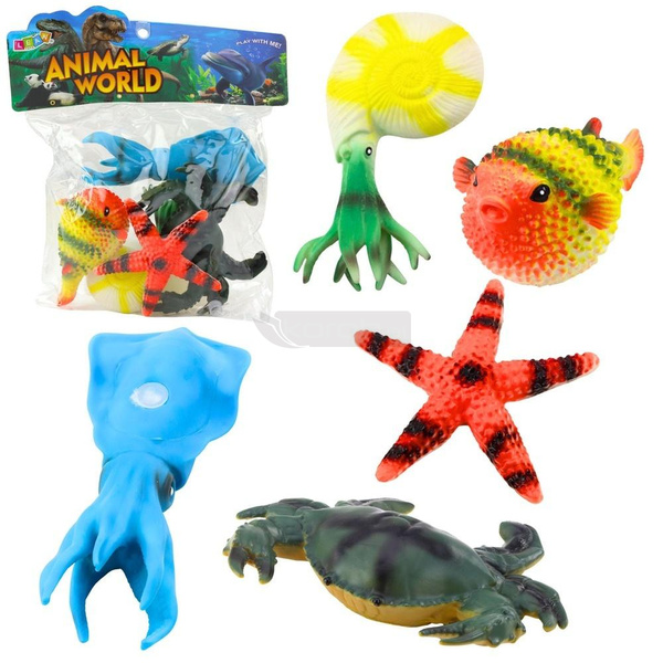 W zestawie znajdziesz: rybkę rozdymkę, kraba, rozgwiazdę, kałamarnicę oraz amonita. Każda figurka ma długość ok. 18-20 cm (w zależności od gatunku), co sprawia, że są one duże i wygodne do zabawy. Figurki zostały wypełnione watą, dzięki czemu są miękkie i przyjemne do ściskania, jednak nie nadają się do zabawy w wodzie.