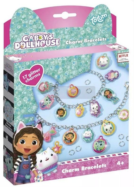 Zróbdwie super urocze bransoletkiz charmsami z Gabi i innymi mieszkańcami domku. Dzięki34wypukłym naklejkomz łatwością stworzysz własną wesołą bransoletkę z mieniącymi siębrokatowymi drobinkami.Jedną dla siebie, a drugą dla najlepszej przyjaciółki