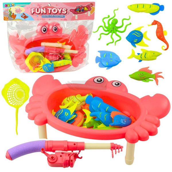 W komplecie znajduje się stolik w kształcie sympatycznego kraba z czterema stabilnymi nóżkami, wędka, sitko oraz aż 10 kolorowych rybek i morskich stworzeń do łowienia. Całość wykonano z bezpiecznych i trwałych materiałów, dzięki czemu zabawka zapewnia długie i bezpieczne użytkowanie.