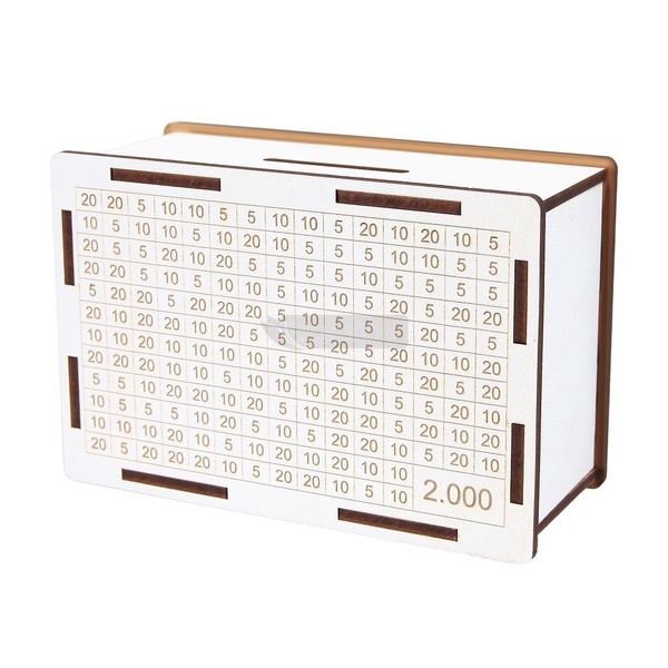 Drewniana, ekologiczna skarbonka z grafiką celu 2.000zł. Na powierzchni skarbonki znajduje się tabelka, w której można wykreślać kolejne wartości nominałów banknotów lub bilonu w miarę dodawania gotówki. Po wykreśleniu wszystkich pól skarbonka będzie zawierać 2.000zł Posiada specjalny otwór na górze do wrzucania monet i banknotów. Skarbonka CRESCO to świetny prezent dla każdego na różne okazje. Skarbonka nie zawiera zawartości, ale po zakupie jest od razu gotowa na przyjecie gotówki :) Skarbonka sprzedawana jest już złożona w opakowaniu foliowym.