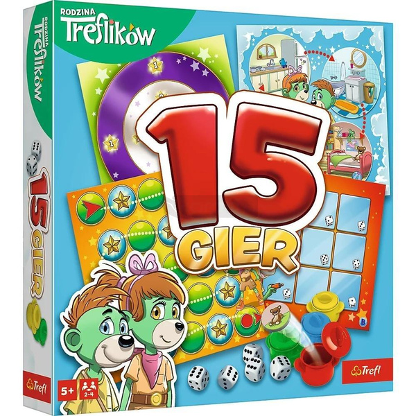 Kalejdoskop 15 gier, w oprawie graficznej z serialu Rodzina Treflików, to zestaw wyjątkowych elementów i plansz.