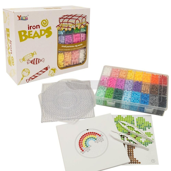 W zestawie aż 24 kolory koralików, 3 podkładki, kwadrat, koło i sześciokąt, 40 dwustronnych kart pracy, 2 pęsety, 2 arkusze papieru do prasownia, kolorowy sznureczek, zawieszki, breloczki.