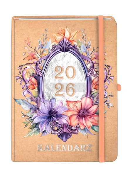 Kolekcja: Kraft, format: A5, wymiary okładki: 144x211 mm, układ: tydzień na stronie, ilość stron: 144,oprawa: twarda, materiał: papier, gramatura papieru: 80g, kolor papieru: chamoise ,dodatki: plan roku 2026, ważne wydarzenia, skorowidz adresowy, notatki, pionowa gumka zamykająca, wstążka, gumka na długopis: tak, zaokrąglone rogi: tak, wyklejka: chamoise, koperta: tak