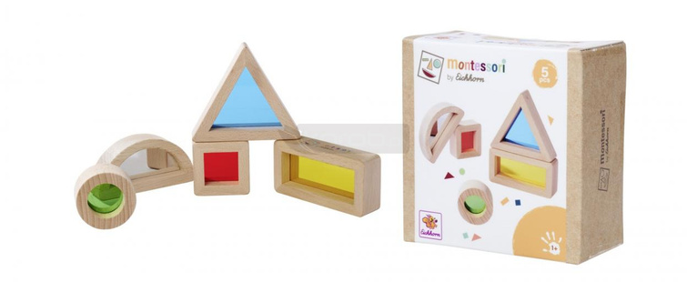 Zawartość: trójkąt, prostokąt, kwadrat, koło oraz półkole z lustrem, 5 elementów, FSC(R) 100%, buk, akryl, 12m+