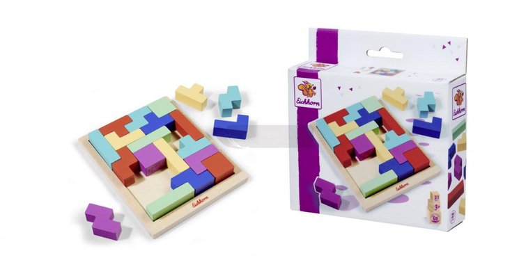 Drewniana ramka (13,5 x 17 cm) z 20 klockami, różne kształty i kolory, 21 elementów, brzoza, 3l+