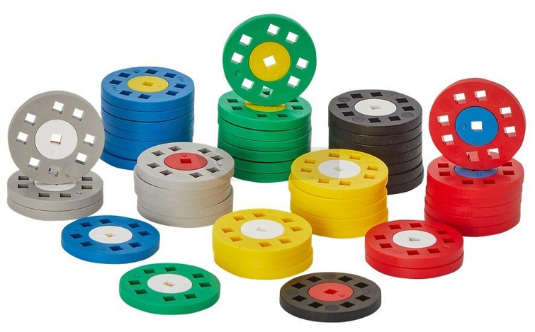 Zestaw zaiwera 48 kół dużych Plus-Plus w róznych kolorach: 8 czarnych, 8 czerwonych, 8 niebieskich, 8 zielonych, 8 żółtych, 8 szarych.