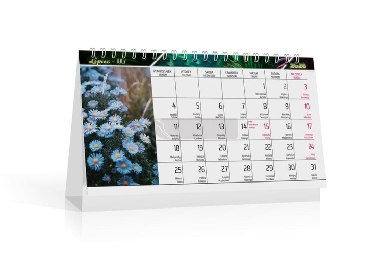 "Kalendarz biurkowy typu namiot, kalendarium w układzie miesięcznym, 24 strony + okładka. Na spirali, papier w środku kreda mat. Wymiary 195x110 mm"