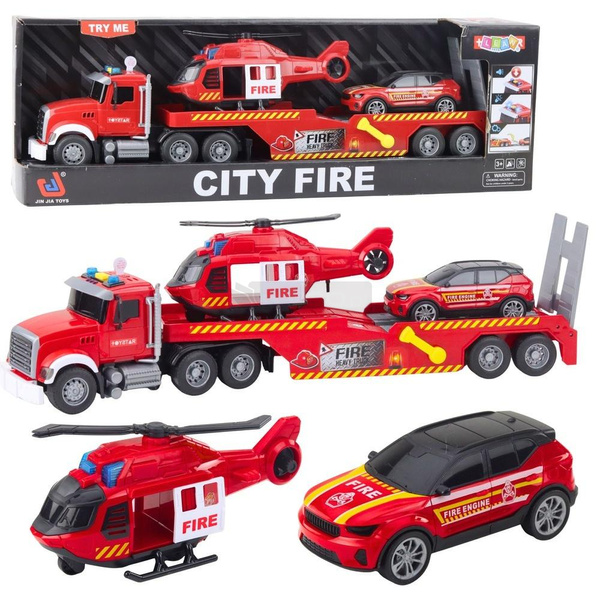 Zestaw strażacki city fire - ciężarówka z lawetą, helikopter i samochód
