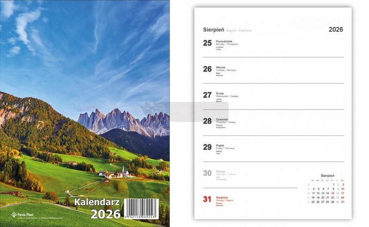 Kalendariumjeden tydzień na jednej stronie, w dolnym rogu skrócony kalendarz miesiąca.