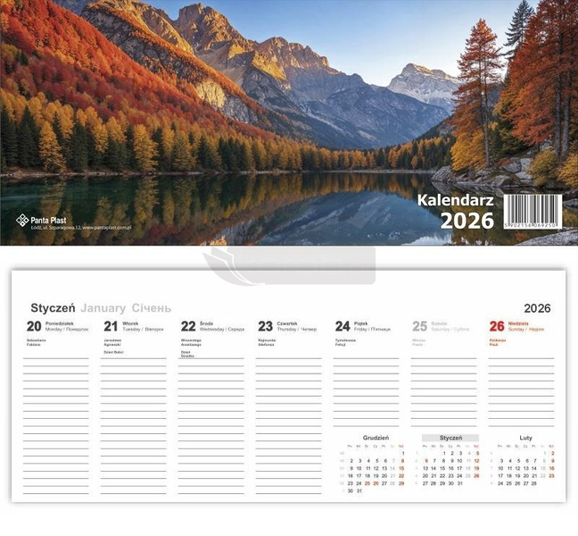 Kalendarium tydzień na jednej stronie, w dolnym rogu skrócony kalendarz trzech miesięcy.
