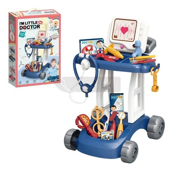Zestaw małego lekarza na wózku z akcesoriami. W komplecie stetoskop, termometr, strzykawka i inne przyrządy medyczne. Wybrane elementy zestawy działają na baterie typu AG13. Baterie znajdują się w zabawce. Zabawka przeznaczona dla dzieci od lat 3. Całość zapakowana w kartonowe pudełko. Podane wymiary są wymiarami opakowania.